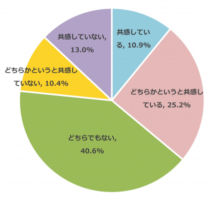 現在所属している会社の「企業理念」に共感しているか質問したところ、36.1%が「共感している」(共感している:10.9%、どちらかというと共感している25.2%)と回答しました。