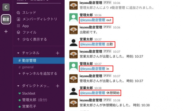 slackのワークスペースに、Slack App『IEYASU勤怠管理』をインストールすることで、slackから出勤・退勤・休憩開始・休憩終了の打刻を行うことができます。slackのチャンネルから出勤・退勤の打刻を行うことができますので、誰が勤務しているのかを簡単に把握することができ、メンバー間のコミュニケーションも取りやすくなります。