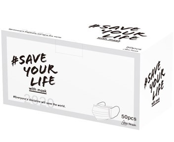 三層構造フィルターで細菌・PM2.5に対応しており、隙間を作らずウィルス飛沫をシャットアウトします。外箱には「#SAVE YOUR LIFE」プロジェクトのロゴが入っています。今後はECサイトでの販売も開始予定で、本品の収益の一部を医療機関などに寄付させていただきます。