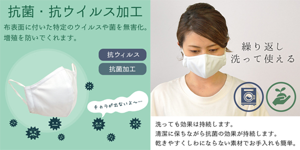 本体・耳ひも部分に抗ウィルス・抗菌機能加工がされており、布表面に付いた特定のウイルスや菌を無害化・増殖を防いでくれます。