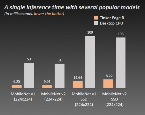 Tinker Edge R搭載のRockchip社製のNPUのAIアクセラレータは、最大負荷時で、たった1.5ワットの電力で3TOPS(Tera-Operations per second)の計算をすることができます。また、RockchipのNPUは、ニューラルネットワークのアーキテクチャーに最適化されています。このため、Tinker Edge Rは、マルチフレームワークの機械学習モデルをサポートしています。Tinker Edge Rは、デスクトップ用のx86CPUと比較しても、ハイパフォーマンスで、低省電力を実現しています。
