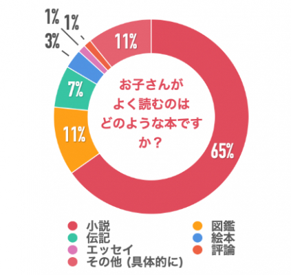 お子さんがよく読む本について教えていただきました。「小説」が65%、「図鑑」が11%、「伝記」が7%と続きました。