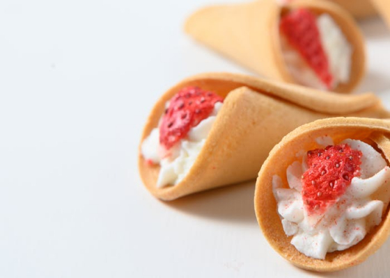 特殊製法によるドライカットした「あまおう」を使用したクリームを、さくさくなラングドシャでつつみこみました。