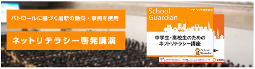 アディッシュが行う講座は、ネットパトロールに基づく最新の動向、事例を紹介しながら、生徒・教職員・保護者が「ネットリテラシー」を理解、定着できる講義です。