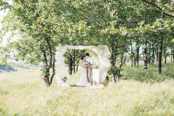 ふたりが誓いをたてる場(簡易挙式会場)として、自宅や自宅近くの広場、思い出の場所、山やビーチなど挙式ができるスペースを用意し、セレモニー装飾を行います。