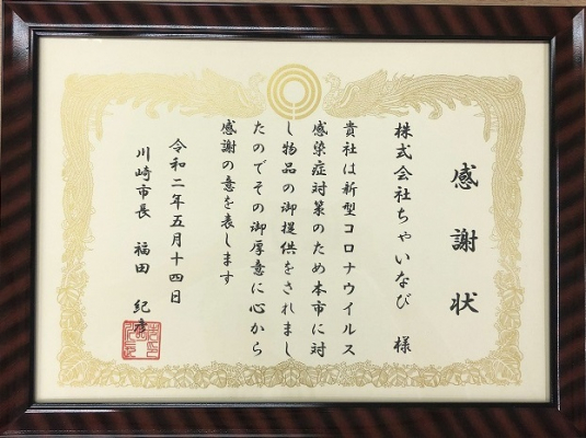 胎児超音波心音計「エンジェルサウンズ」や「パルスオキシメータ」等の医療機器製品を扱う株式会社ちゃいなび (本社:神奈川県川崎市、代表取締役:相馬 喜代子)は、2020年5月25日に、川崎市よりマスク10,000枚寄付に対する感謝状を授与されました。