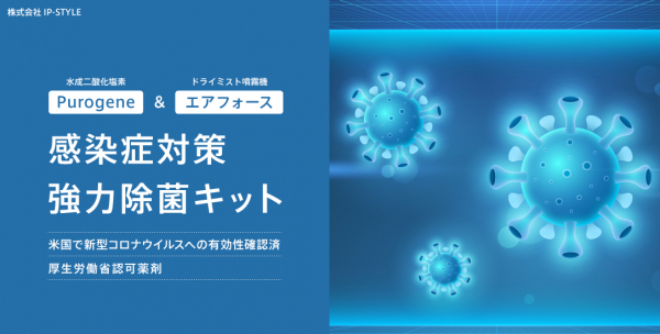 『感染症対策強力除菌キット』は、アメリカ合衆国環境保護庁(EPA)によりCOVID-19を引き起こす新型コロナウイルス(SARS-CoV-2)への有効性が確認され、かつ厚生労働省認可薬剤であるPurogene(Oxine)と、空間除菌に効果的な噴霧器『Air Force』をセットでご提供することで、店舗・商業施設・介護施設・クリニック等における感染症対策にご活用いただくことを目指した商品です。