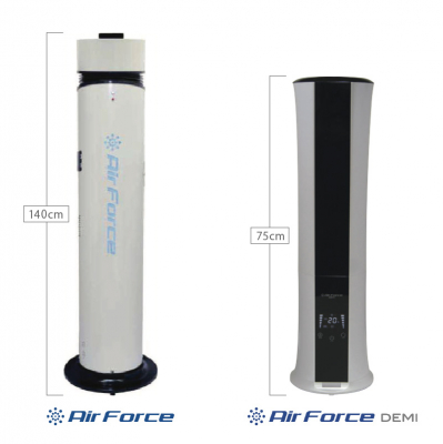 Air Forceは、空間に浮遊するチリやほこりに付着した菌・ウィルスに有効な微小な霧を噴霧する本体と、ウイルスにも有効な薬品水を併せて使用するドライミスト噴霧器になります。