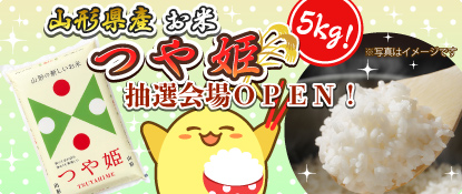 抽選で「山形ブランド米 つや姫 5kg」が当たるよ。