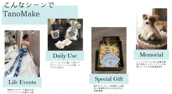 オンラインマーケット「TanoMake(タノメイク)」は“同じじゃイヤを応援したい” をコンセプトに2019年10月にオープン。当サイトに並んでいるアイテムは、メイキストと呼んでいる作り手から出品されたもので、名前を入れられたり、色やサイズが選べたり、すべてカスタマイズが可能となっています。購入者がチャットで気軽にお勧めを聞いたり、細かいリクエストを相談したりと、購入者とメイキストが一緒になっておこなうモノづくりに取り組んでいます。文字や画像を確認しながら、安心してオーダーメイドができるのも魅力のひとつです。実際に、家族や恋人など親しい相手でもギフトとなると迷ってしまう際、メイキストと購入者がアイデアを出し合いながら仕上げていくので、「そういえばブルーが好きだった」「以前会ったときに、チェック柄のハンカチを持っていたな」など、コミュニケーションからヒントが得られます。双方の個性が合わさって、心に響くモノとなり、“オーダーする楽しみ”と“届くまでの楽しみ”のワクワク感を味わうことが可能です。