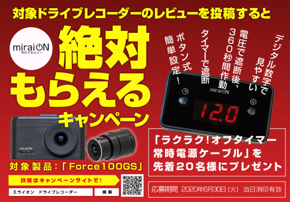 先着20名様へ素敵なプレゼントが当たる!miraion「対象ドライブレコーダーのレビューを投稿すると絶対にもらえるキャンペーン」 - ミスターカード株式会社