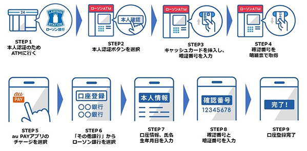 ローソン銀行の即時口座決済サービスは、お客さまの金融機関の口座から決済アプリや電子マネーなどへチャージができるサービスです。ローソン銀行ATMで本人認証(注2)を行い、「au PAY アプリ」で口座登録が完了、口座からau PAY 残高へチャージを行うことで「au PAY」でお支払いいただけます。「即時口座決済サービス」の詳細はこちら(https://www.lawsonbank.jp/product/charge/)をご参照ください。