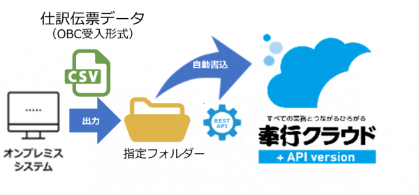 例えば、オンプレミスの販売管理システムから仕訳伝票データのCSVファイルを、あらかじめ指定したフォルダーに出力するだけで「奉行クラウド」へ自動で取り込むことが可能です。