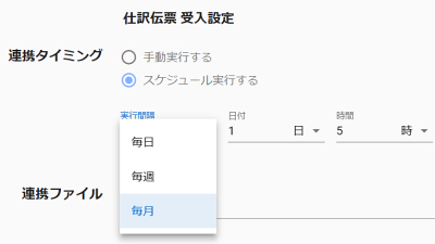 マスター情報の自動受入・自動作成にも対応し、業務処理ごとにスケジュール設定が可能です。補助科目や取引先などのマスター情報を同期した後で仕訳伝票データを受け入れる、といった業務に即した連携に対応できます。