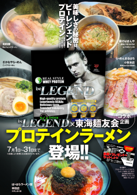 プロテインで初めてモンドセレクション最高金賞を5年連続受賞中のビーレジェンド プロテインを展開する株式会社Real Style(本社:奈良県大和高田市、代表取締役:鍵谷 健、以下弊社)は東海地区屈指のラーメン店主から構成され、東海地方の旨いラーメンの発信を目的とする「東海麺友会」とコラボしたプロテインラーメンを2020年7月1日(水)〜2020年7月31日(金)まで限定で下記の店舗にて販売することを決定致しました。