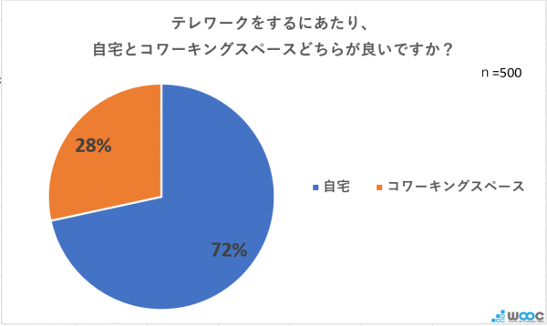 対象者500人に、テレワークをするにあたり自宅かコワーキングスペースのどちらが良いか調査したところ、全体の72%が「自宅」、28%が「コワーキングスペース」と回答しました。