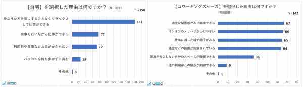 また、「コワーキングスペース」派に理由を聞いたところ、「適度な緊張感があり集中できる」、「オンオフのメリハリがつけやすい」、「仕事に適した机や椅子がある」、「通信などの設備が完備されている」という回答が多くなりました。