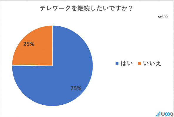 対象者500人に「テレワークを継続したいですか?」と聞いたところ、75%の人が「はい」と答えています。