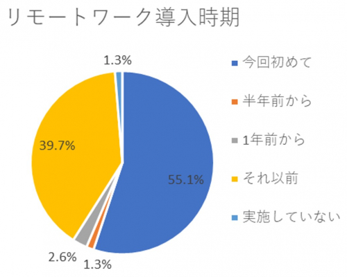 今回の調査の中で、「リモートワーク導入時期」について尋ねたところ、新型コロナウイルス感染症の感染拡大の影響を受けて「初めて導入した」と回答した企業が全体の56.6%となり、最多の回答となりました。次いで多かった回答が「1年以上前から導入している」との回答で、全体の38.6%を占めていました。リモートワーク導入について、新型コロナウイルス感染症の影響を受けて導入が進んだ企業が半数以上存在していることが明らかになりました。
