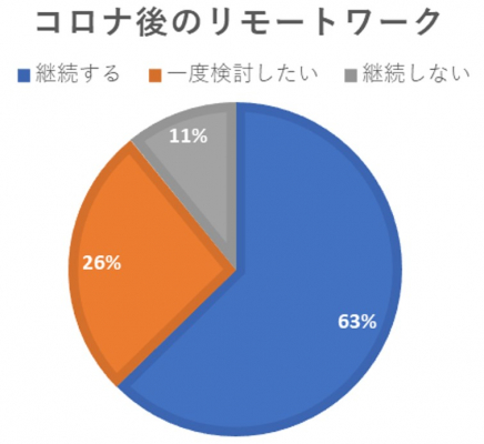 「新型コロナウイルス終息後のリモートワーク継続の有無」について尋ねたところ、全体の62.7%の企業が「継続する」と回答し、多くの企業で新たな働き方としてリモートワークを推進する意欲が高い傾向が分かりました。