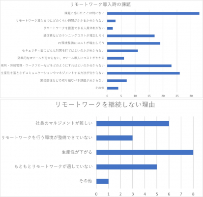 上記の質問で「継続しない」と答えた企業に「リモートワークを継続しない理由」を尋ねたところ、「生産性が下がるため」という回答が最も多く66.7%となり、次いで50%が「社員のマネジメントが難しい」、41.7%が「もともとリモートワークが適していない業態・仕事内容であったため」と回答。リモートワークを継続しない企業では、生産性の維持や社員のマネジメントに苦慮している状況が明らかになり、ウィズコロナ時代では新たなワークスタイルに適した業務設計、マネジメント手法が多くの企業で求められていると考えられます。