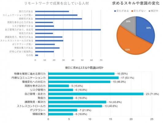 これらのデータから、ウィズコロナ時代の新しい働き方の中では、周囲の目がなくても自力で仕事を進めることができ、またオンライン会議などの新しいスタイルに柔軟に適応できる人材、そしてオンラインでのコミュニケーションでも相手に伝えるべきことを的確に伝えられる人材が高く評価される可能性を読み取ることができます。