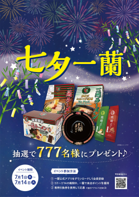 株式会社一蘭(創業:昭和35年/本社:福岡県福岡市博多区/代表取締役社長:吉冨 学)では、7月1日(水)より期間限定イベント「七夕一蘭」を実施いたします。期間中、一蘭公式アプリにて来店ポイント獲得の度に、1枚の応募券が後日付与されます。応募いただいた方の中から抽選で、豪華賞品が当たります。当選人数は七夕にちなみ、一蘭史上最大の777名様!「七夕一蘭」を通してより多くの皆様に幸運が訪れることを祈っております。