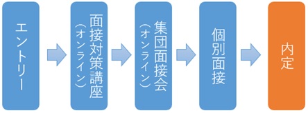 京都橘大学および京都の大学に通う4年生を対象に、面接対策講座と集団面接会をオンラインで行います。参加学生は事前予約をした上で、Web面接での印象アップのコツや面接時のマナーといった就活スキルをオンラインで学習。その後、書類選考なしのオンライン集団面接会に参加します。オンライン集団面接会は一部、二部の二部構成で、学生は両方に参加することができ、ここで約16社の企業と面接することができます(二部とも参加した場合)。オンライン集団面接会後は個別面接対策を行いながら内定を目指します。