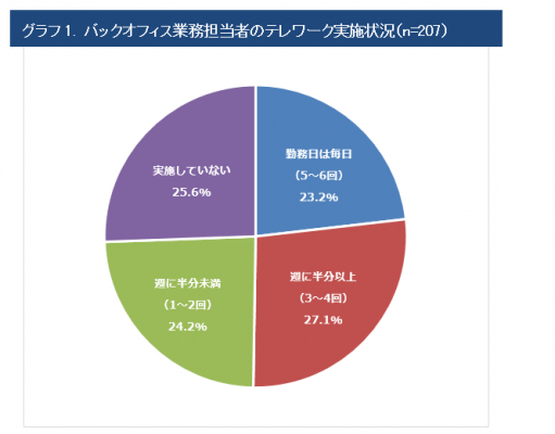 バックオフィス業務担当者の74.4%がテレワークを実施していました。全回答者を対象とした設問においては、テレワークを実施した企業の割合は90.4%であることから、バックオフィス業務の担当者はその中では出社を要することが多いと言えます。