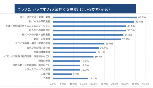 テレワークをはじめとした新型コロナウイルスの感染予防対策の影響で支障が出ている業務内容としては、「決裁(稟議)業務」、「契約業務」、「決算・出納業務」といった紙ベースの業務と、電話対応も含めた外部とのコミュニケーションの課題が多く挙げられました。特に紙ベースの業務については、業務部門がテレワークを行う一方でバックオフィス部門は一定の出社を要するという偏りを生む要因にもなっているようです。