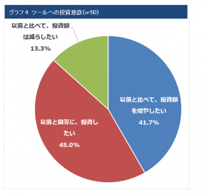 そうした業務の改善のため、「ビデオ会議システム」、「リモートアクセスサービス」、「ワークフローシステム」、「電子契約」等のソリューションに注目が高まっており、41.7%は「以前と比べて、投資額を増やしたい」と回答しています。