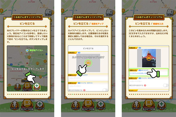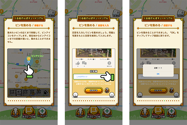 3.クイズに正解するとピンがもらえる。いろんな場所に行ってピンをコレクションしよう。
