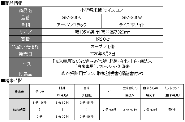 エムケー精工株式会社(本社:長野県千曲市、代表取締役:丸山将一)は、0.5合〜2合の精米ができる小型精米機「ライスロン」をリニューアルし、8月3日から全国の家電量販店ほかで発売します。