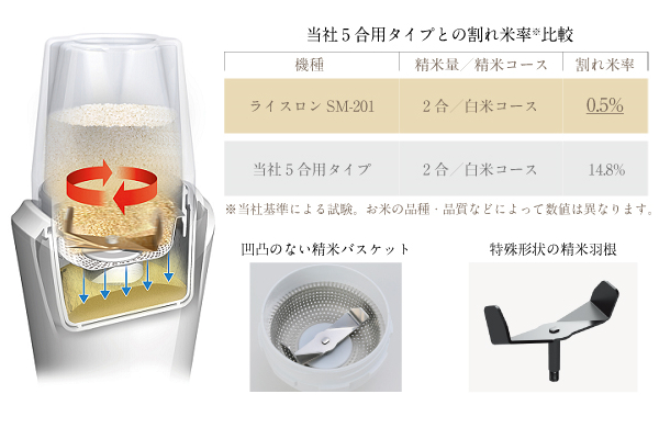 凹凸のない精米バスケットと特殊形状の精米羽根が、滑らかな対流を生み出し、食味低下の大きな原因といわれている割れ米の発生を防ぎます。また、特殊形状の羽根がお米の対流を促し、栄養豊富な胚芽が多く残るやさしい精米を実現。お米同士の摩擦を誘発させ、無理なくぬか層を剥ぎとります。