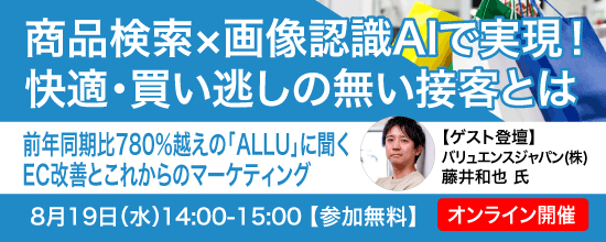 商品検索×画像認識AIで実現!快適・買い逃しの無い接客とは『前年同期比780%越えの「ALLU」に聞く、EC改善とこれからのマーケティング』オンラインセミナー開催のお知らせ