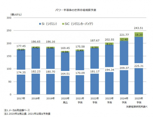 【矢野経済研究所プレスリリース】パワー半導体の世界市場に関する調査を実施(2020年)〜パワー半導体世界市場は2021年から回復基調となり、2025年には243億5,100万ドルまで拡大すると予測〜