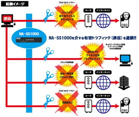今回リリースする商品は感染の拡大を防止するために、各段階でサイバー攻撃をスイッチにより遮断し、ウイルスの行う異常な通信を検知・遮断して、攻撃の最終目的であるデータの破壊や漏洩などを阻止する技術を有しています。これにより、サイバー攻撃による被害の拡大を防ぐことが可能となります。