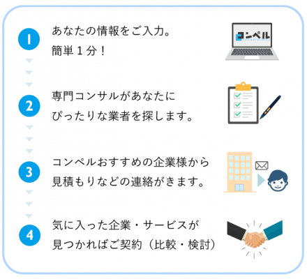 コンペルは、製品やサービスの導入を検討している担当者と各業界サービスの優良企業をつなぐためのビジネスマッチングサイトです。コンペルから一括見積もり依頼や一括資料請求が可能なので、何社もある発注先をイチから探す手間を省くことができます。