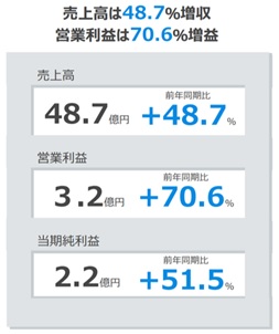 上場後初となる2020年3月期通期決算発表においては、売上高が 48.7%増収、営業利益が 70.6%増益となり、10年連続での増収となりました。