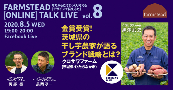 干し芋の名産地、茨城県の干し芋品評会において史上初の2年連続W金賞を受賞したクロサワファーム。原料いもの生産からほしいもへの加工製造までを一貫して自社で行なっています。デザインブランディングをどのように活用してゆくのか、代表の黒澤武史さんとのトークライブです。