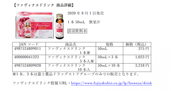 株式会社富士薬品(本社所在地:埼玉県さいたま市 代表取締役社長 高柳昌幸、以下「当社」)は、30代女性向けの新ブランド「favenus(ファヴィナス)」より、第一弾として働く女性のための美容ドリンク「ファヴィナスドリンク」を8月1日から全国で発売いたします。
