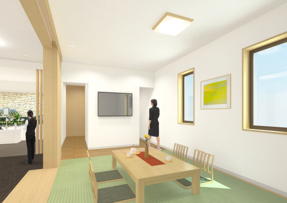 「家族葬」は、多くの参列者が集う儀礼儀式とは異なり、ご家族や親しい人たちで比較的自由な形で見送るお葬式です。当社の式場は適度に小規模で、自宅のようにくつろげることをコンセプトとしています。また、他の誰にも気兼ねせずに過ごせる家族葬ホールにふさわしく「1日1組」の貸切ですので、最期の時までゆっくりとそのご家族ならではの過ごし方ができます。故人様を囲んで生前と同じように家族団欒のひとときをご提供したいと考えています。