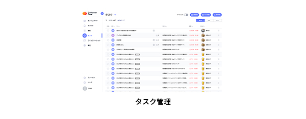 CustomerCore は、基幹システムや CRM/SFA にある顧客関連データやメールなどのコミュニケーションデータを CustomerCore CDP(Customer Data Platform)に集約し、システムがそれらのデータを自動巡回することによって、顧客の状態変化をタイムリーに把握することができる Web システムです。優先すべき顧客や、“いま” 対応が必要な顧客を検知することができるため、タイムリーかつプロアクティブな活動を実現できる点が特長です。その他、顧客ごとに設定したタスクの管理機能や他部門の活動も含めた顧客コミュニケーションのタイムライン表示機能など、カスタマーサクセス業務を円滑に進めることに特化した機能が多く実装されています。
