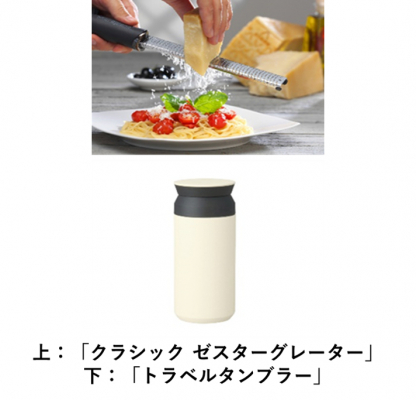 賞品は、シェフや料理研究家などプロも愛用するチーズやしょうがをおろしてそのまま料理にふりかけられるMicroplane「クラシック ゼスターグレーター」か、真空二重構造による優れた保温保冷効果とグラスやマグのような自然な口当たりが魅力の携帯タンブラーKINTO「トラベルタンブラー350ml」が選べます。