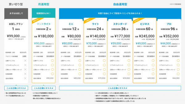 サービスの提供開始に伴い、9月30日までの申込で2020年12月31日まで6回の配信が無料になるトライアルキャンペーンを実施します。また、無料キャンペーンと合わせて、すぐに配信できる機材一式を特別価格になった2つのセットプランも各100社限定で提供します。