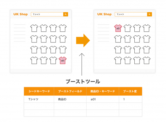 そのご要望にお応えし、「ブースト機能」を追加し、ユニサーチをバージョンアップしました。「ブースト機能」を利用することで、特定のキーワードや特定のカテゴリに対して任意の商品(群)の検索結果順位を手動で調整できるようになりました。