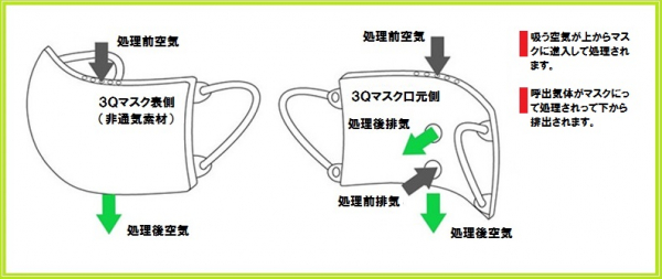 ■「3Qマスク」の最大の特徴は正面隔離、上下隔離、呼気吸気隔離の三つ隔離(Quarantine)構造です。正面から空気を隔離し、上方から吸気をマスクに進入させ、呼気をマスクの下方から排出させる機能を備えており、この「3Qマスク」があれば、近距離での会話だけでなく、安心して交通機関を利用し、イベントに参加することができ、更には観客入りの東京五輪を開催することができます。