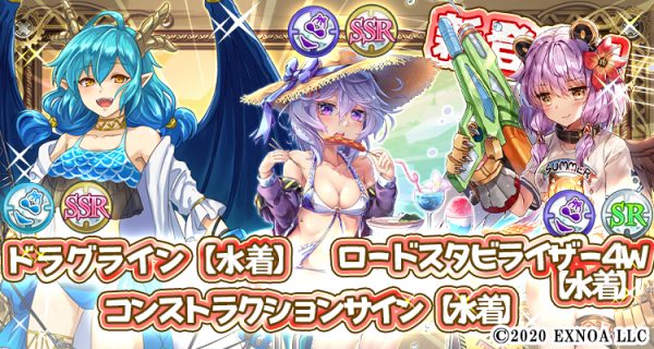 水着(青)属性期間限定SSR「ドラグライン【水着】」、水着(紫)属性期間限定SSR「コンストラクションサイン【水着】」、水着(紫)属性期間限定SR「ロードスタビライザー4W【水着】」が金ガチャに登場!