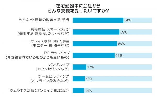 会社から受けたい支援:1位「自宅のネット環境」、2位「通話料」、3位「オフィス家具購入」