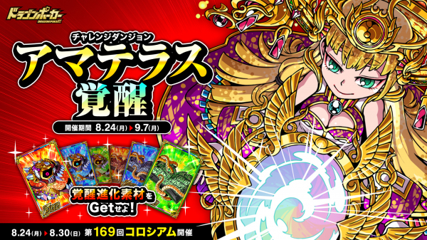 株式会社アソビズム(本社:東京都千代田区、代表取締役:大手智之)は、App Store・Google Playにて好評配信中のリアルタイム合体カードバトル『ドラゴンポーカー』で、2020年8月24日(月)より復刻チャレンジダンジョン「アマテラス覚醒」を開催いたします。